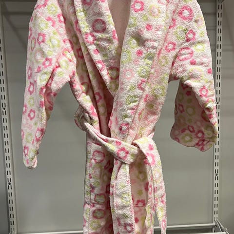 Tyttöjen kylpytakki. Väri kirkas pinkki. Ehjä. Siisti. Muutama yksittäinen pieni langannousu.