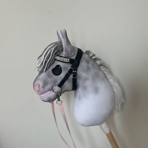 Valmistettu velboakankaasta, harja villalankaa. Korvissa kovikkeet eli pysyvät aidon hevosen korvien muodossa. Kaikki osat hevosessa on ommeltu kiinni eli ei liimattuja osia. Keppi kuuluu hintaan kiinnitettynä, kuvassa irtonaisena.
