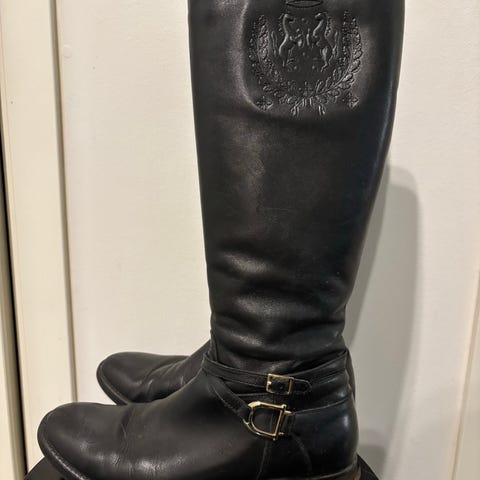 Mustat nahkasaappaat. Pitävä pohja, kantalaput jonkin verran kuluneet, reilu malli, Pohje 36cm, nilkka 26cm, varren korkeus 39cm. Kevyt vuori