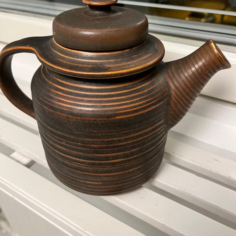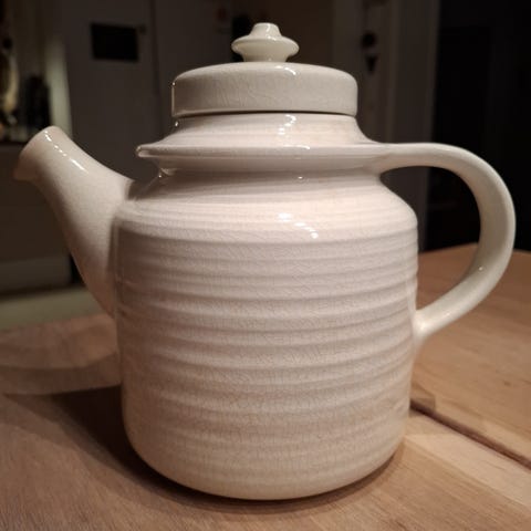 Arabia Saara teekannu. Deging Anja Jaatinen-Winqvist. Kannussa on sinivalkoinen kuviointi ja siihen kuuluu irrotettava siivilä. Soveltuu teen valmistukseen ja tarjoiluun. Kestää konepesun. Uudenveroinen
