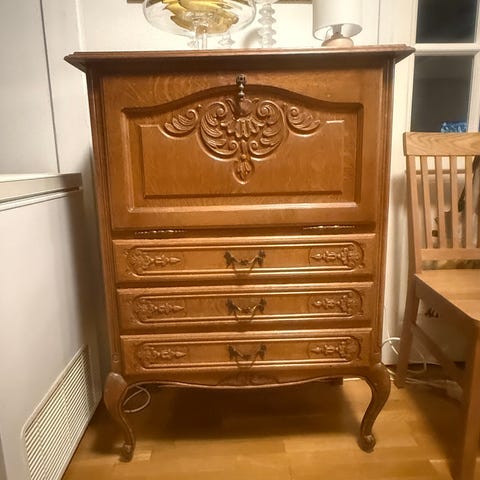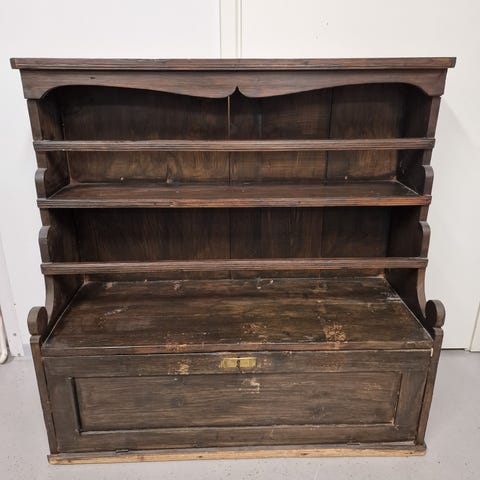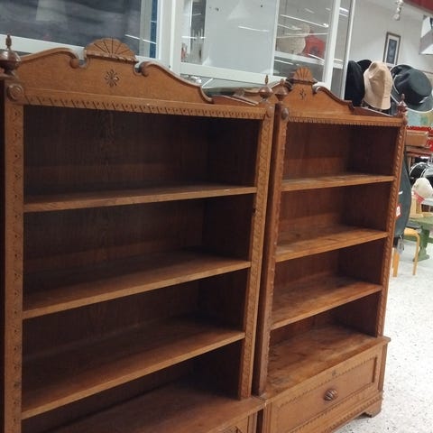 Kaunis vanha tamminen avohylly, yläosan koriste korjattavissa 2 puutapin vaihdolla ja liimalla.