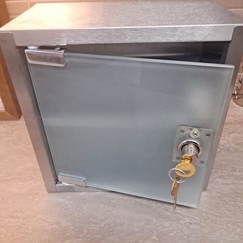 Musta metallinen lukollinen kaappi. Soveltuu esimerkiksi työkalujen tai muiden tarvikkeiden säilytykseen.