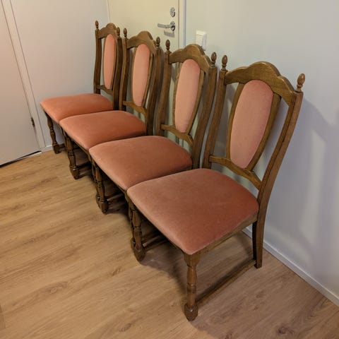 Viehättävät tuolit uusin, laadukkain pallukkakankain. Istuinosassa kevyt jousitus, miellyttävät istua. Puuosat hyvässä kunnossa. Istuinkorkeus 47cm. Hinta / kpl.