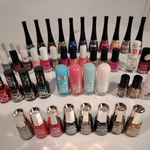 Erilaisia geelikynsilakkoja ja koristelutarvikkeita. Joitakin lakkoja olen käyttänyt ahkerasti, mutta sitten on myös lähes käyttämättömiä.