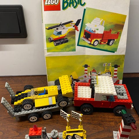 LEGO Basic-rakennussarjan palikoilla voit rakentaa huoltoaseman, kaksi henkilöautoa, antiikkiauton, traktorin ja lentokoneen.