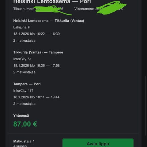 VR Pasila Tampere junalippu yhdelle henkilölle matkalle 14.1.2026 klo 09:06 - 10:53. Lähetän spostiin lipun maksua vastaan.