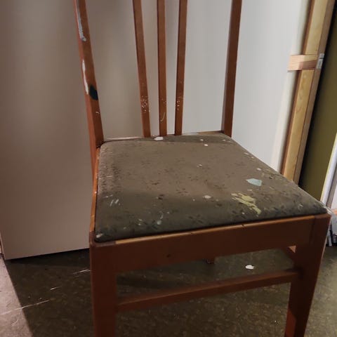 Vanha puinen tuoli, jossa on kukkakuvioitu kangas, mahdollisesti alkuperäinen. Tuolissa on koristeellinen selkänoja ja käytönjälkiä. Parissa liitoksessa liimattavaa, etujaloista puuttuu kupariset koristeet ja toinen jalka on halki (joku joskus liimannut huonosti). Saa hakea jos joku tämän haluaa vielä entisöidä. Leima on.