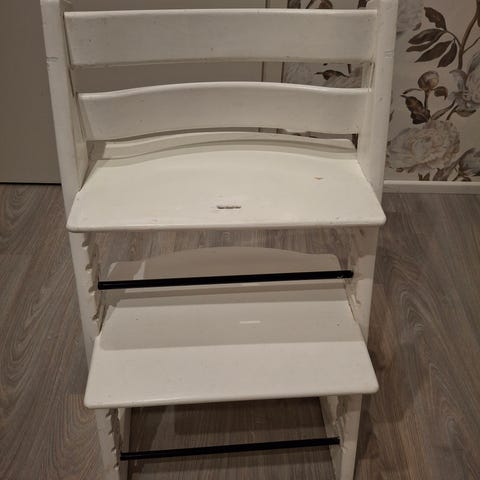 Stokke lasten tuoli. Käytön jälkiä löytyy, paikoin maali kulunut/lähtenyt. Kaikin puolin ehjä.