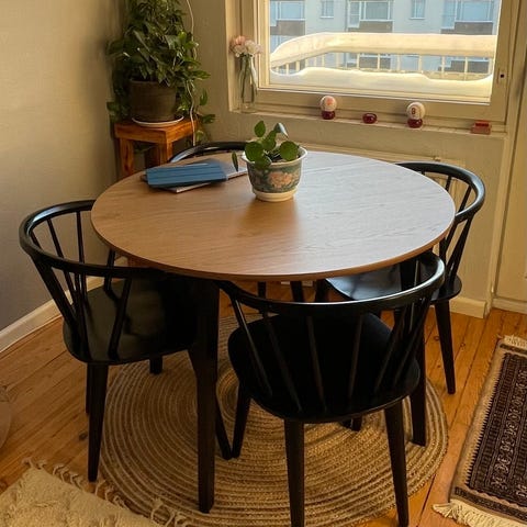 Myydään isomman pöydän tieltä 105cm leveä pyöreä pöytä sekä 4 tuolia.