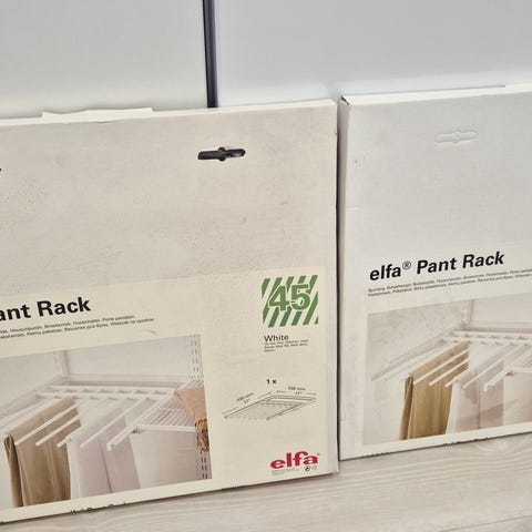 Kaksi Elfa-merkkistä hyllynkannaketta ja lisäksi kaksi koukkua.