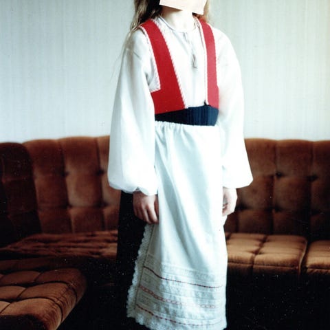Asuun kuuluu paita, kaulakoru, liivi ja hame.
