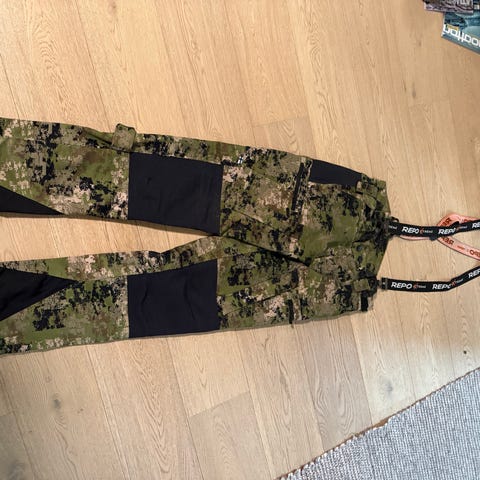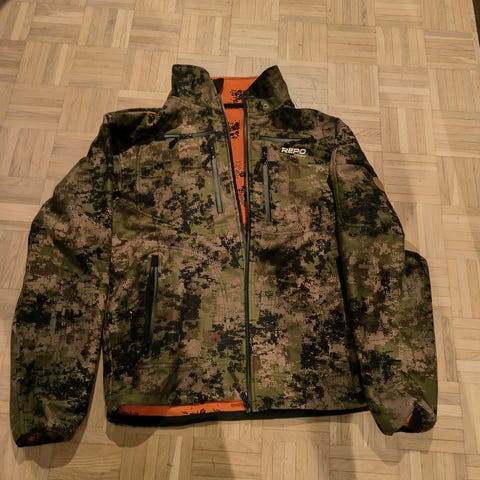 Hyvä ja ennenkaikkea hiljainen puku, toimii hyvin esim metsäkanojen pyyntiin. Toisessa housun lahkeessa alle sentin mittainen vekki, muuten ehjät. Käännettävä joten saa myös täysin oranssiksi. Koko xxl