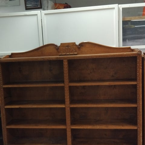 Upea, tukeva tamminen avohylly jossa alhaalla ovellinen säilytysosa. Avaimia ei ole.