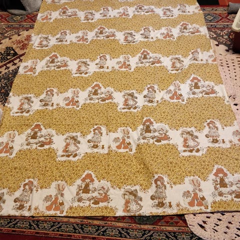 Vanha pussilakana koko 140 x 200cm. Muutamia paikkausompeleita. Reunoissa kulumaa. Kangas tuntuu kuitenkin vielä tanakalta. Pohjaväri vaalea keltainen/kellervä. Kuviot kirkkaat. Tuunaukseen tai pussilakana pidettäväksi. Nouto tai lähetys.