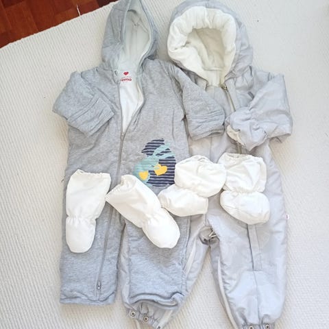 Reiman toppahaalari, villahaalari, pipo, valkoiset tuulenpitävät lämpörukkaset ja –töppöset. Vain toppahaalaria on vähän käytetty, muut ovat uudet.