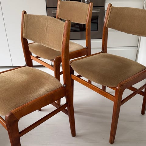 Lahden Puukaluston valmistama laadukas ruokatuolisetti (4 kpl) 1950–60-luvulta.