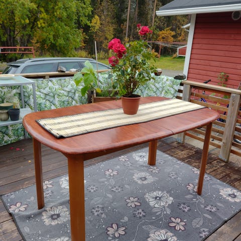 Ikean IDANÄS-malliston klaffipöytä. Kyseessä olevan pöydän valmistus lopetettu. Ostettu kesäkuussa 2025 eikä käytön jälkiä näy.