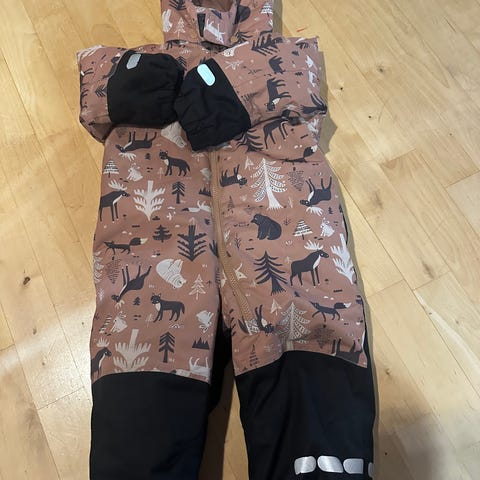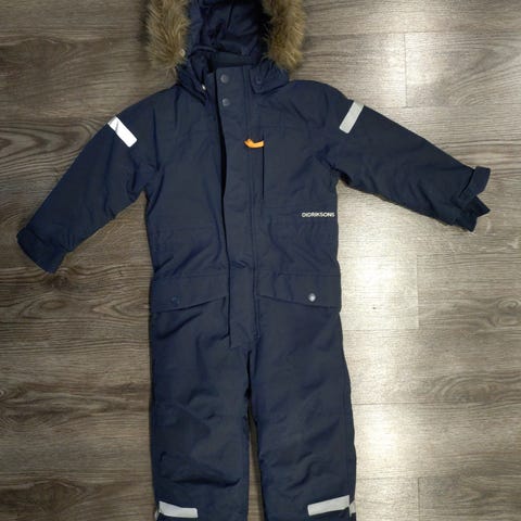 Uutena ostettu ja yhdellä lapsella ollut yksittäiset kerrat käytössä kovien pakkasten aikaan. Ei ole pesty, ominaisuudet tallessa. Kuvissa näkyy käytönjäljet. Musta tahra hihassa näkyvin; ei ole koetettu poistaa. Hihan ja lahkeiden käyttöjälki varmasti pesussa lähtee; näitäkään ei koetettu poistaa. Lahkeet ehjät, kumilenkit tallessa.