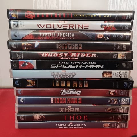 DVD Marvel elokuvia joka lähtöö ja kaikista löytyy suomi tekstitykset ja muilla kielillä vaikka kannet olisivat eri maan kieliset. 3euroo KPL tai kaikki täys hintaan.