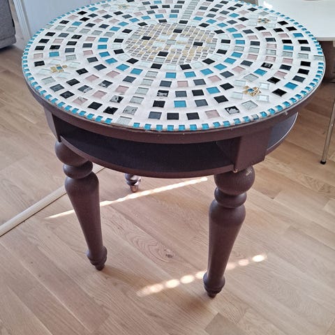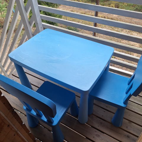 Myytävänä pöytä (60cm x 60cm x 44 cm) sekä kaksi jakkaraa (26cm x 26cm). Pöydän kannessa peli. Käytön jälkiä löytyy mutta ihan siistissä kunnossa. Kaikki jalat tukevasti kiinni.