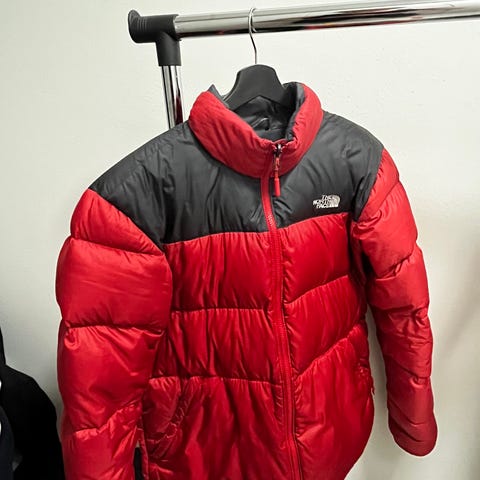 Myynnissä punainen North Face takki. Koko s. Takissa on käytön jälkiä kuten kolmannessa kuvassa näkyy. Nouto Munkkivuoresta.