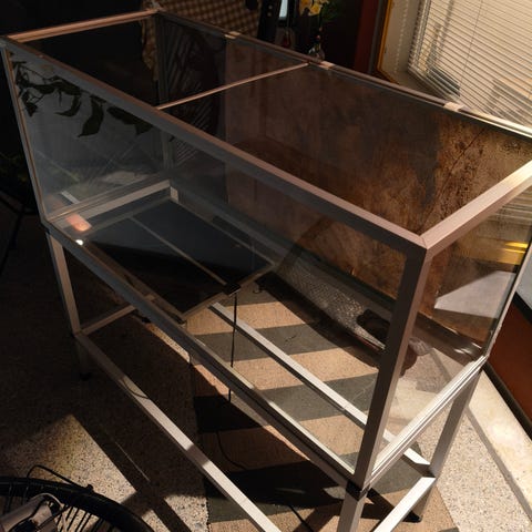 Happi aukot terran takana ja päällä. Lasi ovissa on lukitus. Ollaan viritelty tähän oma mekanismi vesipullon kiinnitykseen mutta sen saa tarvittaessa irti vain katkaisemmalla naru. Mitään halkeamia ei ole.