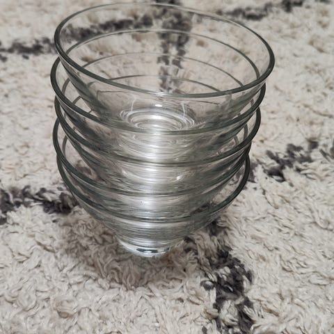 Käyttämätön Lotus kulhosarja, 1 salaattikulho ja 6 jälkiruokakulhoa. Isossa kulhossa valmistuksessa tullut kupla.