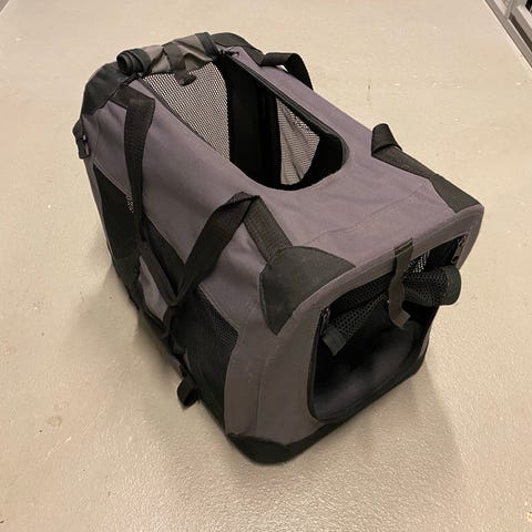 Ollut käytössä kissalla. Pohjalla irrotettava alusta, jonka pois oton jälkeen kassin saa taiteltua kasaan.
