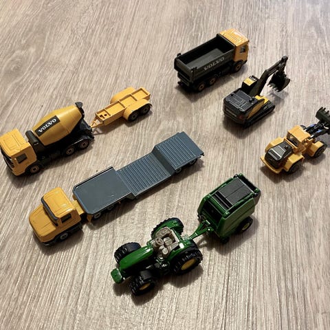 Pienet puiset autot ja traktori.