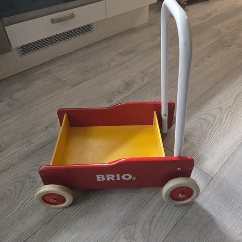 Harmaansävyinen taaperokärry palikoilla. Palikoissa numeroita ja kirjaimia.