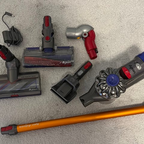Dyson V8 langaton pölynimuri oranssilla varrella. Imuri on varustettu useilla suulakkeilla ja soveltuu erilaisten pintojen puhdistukseen.