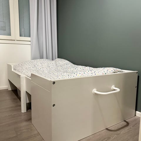 Annetaan Muuramen Jolla-mallinen jatkettava lasten sänky. Pituutta voidaan säätää alkaen 135 sentistä. Patjan leveys 75 cm, ulkomitoiltaan leveys 85 cm.