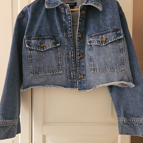 Sininen farkkutakki, koko S. Naisten takki, jossa on painonapit ja rintataskut. Materiaali on farkkukangasta.
