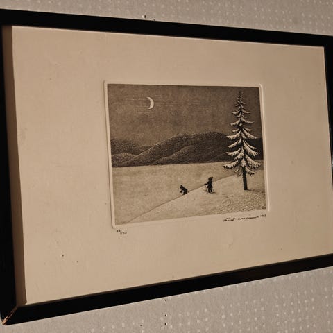 Kehystetty paspiksen kanssa lasin alle. Paspis jälleen tyypillisesti iso. Vuosiluku 1982 kehys hopeamaalattu puu