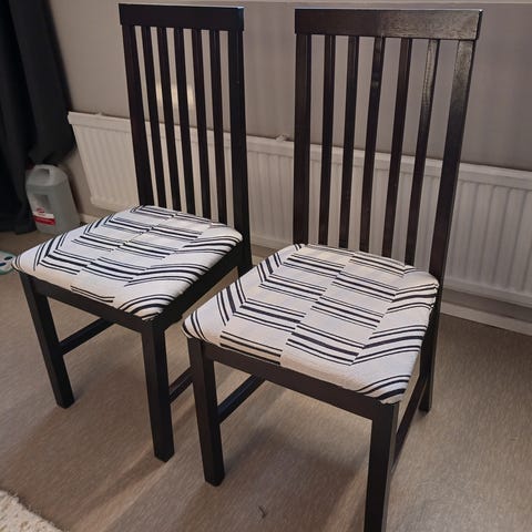 Kaikki tuolit ehjiä, maali osassa tuoleista muutamista kohdista kulunut. Tuolit voi aina halutessaan hioa ja käsitellä uudelleen, mutta ovat täysin käytettävissä tuollaisenakin.