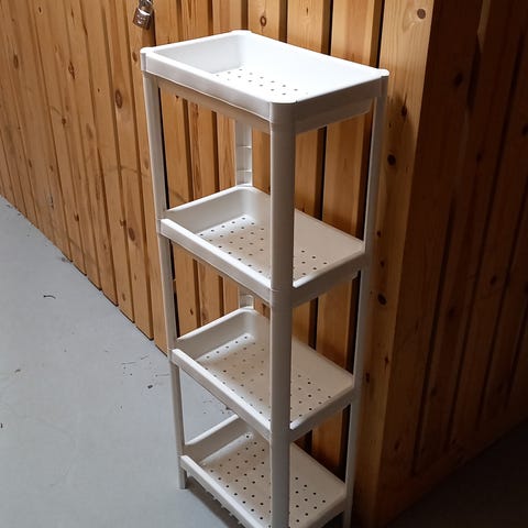 Metallinen hyllyvaunu, jossa kolme kerrosta ja pyörät. Väri valkoinen. Soveltuu säilytykseen ja siirrettäväksi tilasta toiseen.