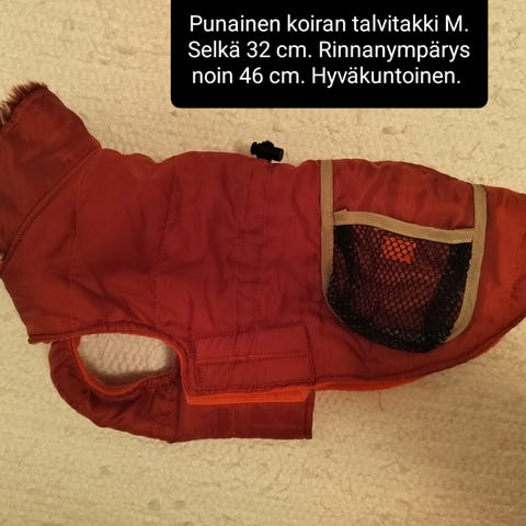 Myydään hyväkuntoinen isomman mäyräkoiran tai vastaavankokoisen koiran takki. Väriltään beigenvärinen. Takki suojaa hyvin pakkaskeleillä ja on mukavan lämmin.