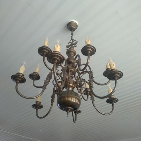 Art Nouveau -tyylinen messinkinen lamppu esittelee koristeellisen ja symbolisen koostumuksensa, joka on tyypillinen 1800-luvun lopulle ja 1900-luvun alkuun. Pääosassa on putto, luonnollisesti muotoiltu alaston poikahahmo, joka pitää kädessään viinirypälekorin, klassinen runsauden ja nautinnon symboli. Tämä hahmo istuu runsaasti koristellun pohjan päällä, jossa on kasviaiheisia motiiveja, voluutteja ja kaarevia jalkoja, kaikki valettu messinkiin, jossa on ikääntynyt patina, jäljitellen antiikkista pronssia.