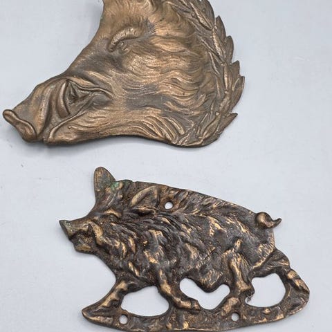 Koristeltu seinälevy, jossa on leijonan pää pronssin näköisenä.