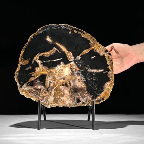 Upea kivettyneen puun viipale räätälöidyllä jalustalla.