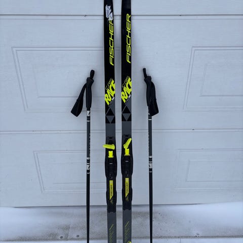 Fischerin 137cm pitkät sukset NNN siteillä ja 105cm pitkät sauvat.