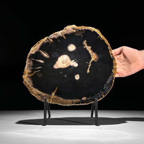 Upea kivettyneen puun viipale räätälöidyllä jalustalla.