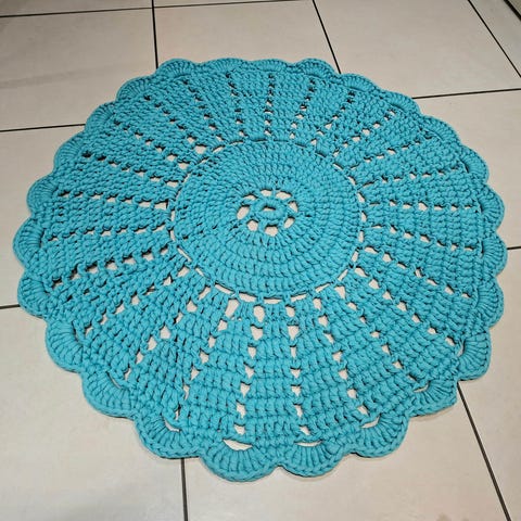 Pyöreä virkattu vaaleanpunainen-valkoinen matto. Uudenveroinen. Halkaisija noin 86cm. Postitus onnistuu.
