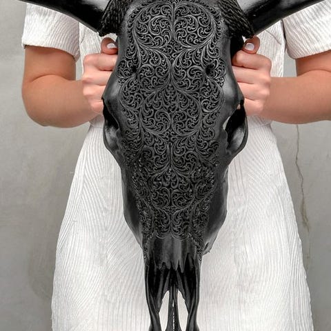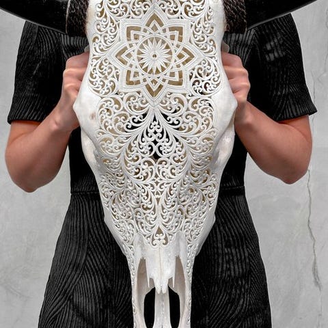 Käsin kaiverrettu suuri härkäkallo, jonka ovat kaivertaneet taiteilijat, jotka ovat siirtäneet kaiverruksen muinaisen taidon isältä pojalle. Kallo on täysin käsin veistetty suurella huolella. Se on epätavallinen, koristeellinen kappale.