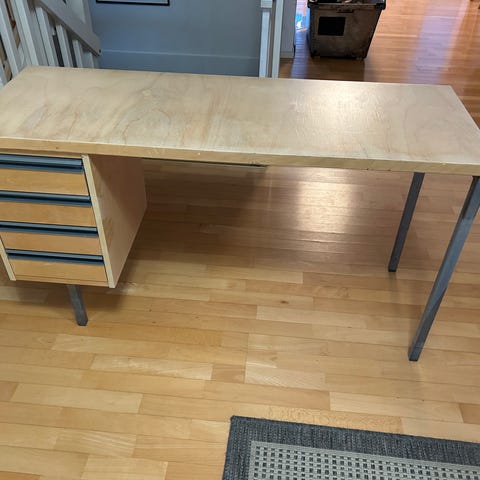 Myydään puuta ja melamiinia oleva lasten työpöytä laatikolla. Tummansininen / puunväri.