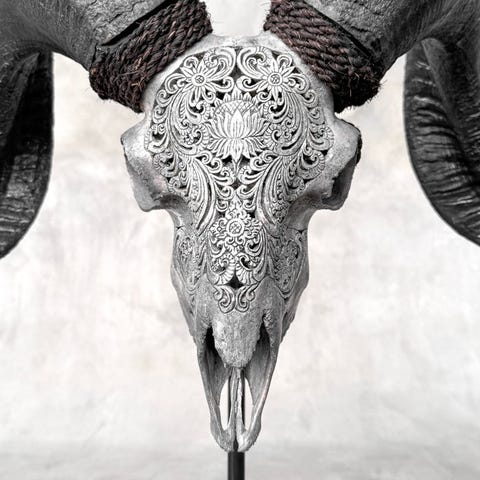 Koska kyseessä on luonnollinen kallo, siinä saattaa olla joitakin luonnollisia pieniä halkeamia ja uurteita sekä kallossa että sarvissa. Tämä on normaalia. Katso kuvat viitteeksi.
