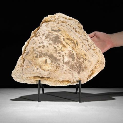 Kaunis viipale fossiilista palmupuun runkoa, jossa on upeita värisävyjä ja tyypillinen puhkeama. Kuoren näkyvyys on selkeä ulkopuolella, ja palmupuun tyypillinen muodostuma erottuu keskellä. Osan sisäosasta on geodeettisesti kiteytynyt. Viipale on erittäin kauniisti kiillotettu, mikä tekee yksityiskohdat selvästi näkyviksi.