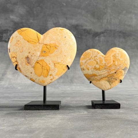 Kauniisti kiillotettu puolikuu-muotoinen Maligano jasperista valmistettu, räätälöityyn jalustaan asetettu.