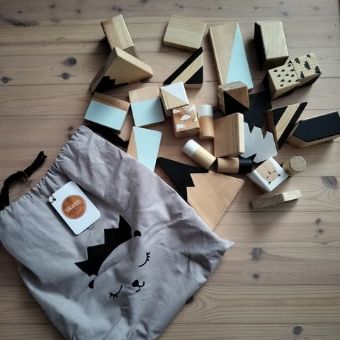 Setti sisältää 23 eriväristä ja -kokoista puupalikkaa.