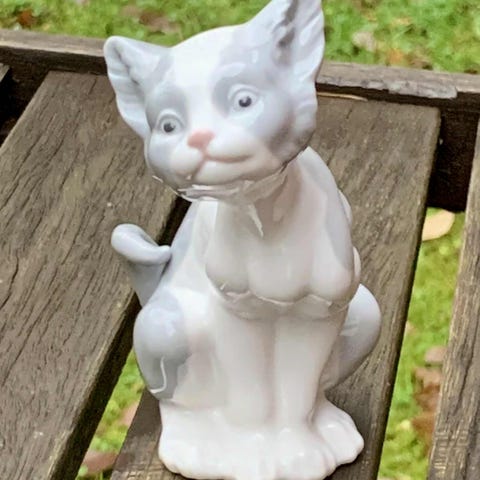 Vintage Nao by Lladrón valmistama posliininen kissahahmo, jolla on vaaleansininen rusetti kaulassa.